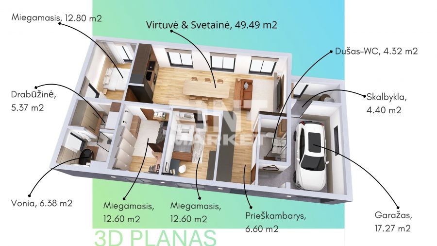 - 4 kambariai (3 miegamieji), du sanitariniai mazgai, pagalbinė patalpa, garažas;